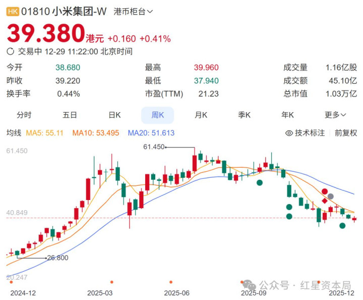 截至12月29日发稿,小米股价报39.38港元,相比起6月61.45港元的高点,已下跌约31.7%。