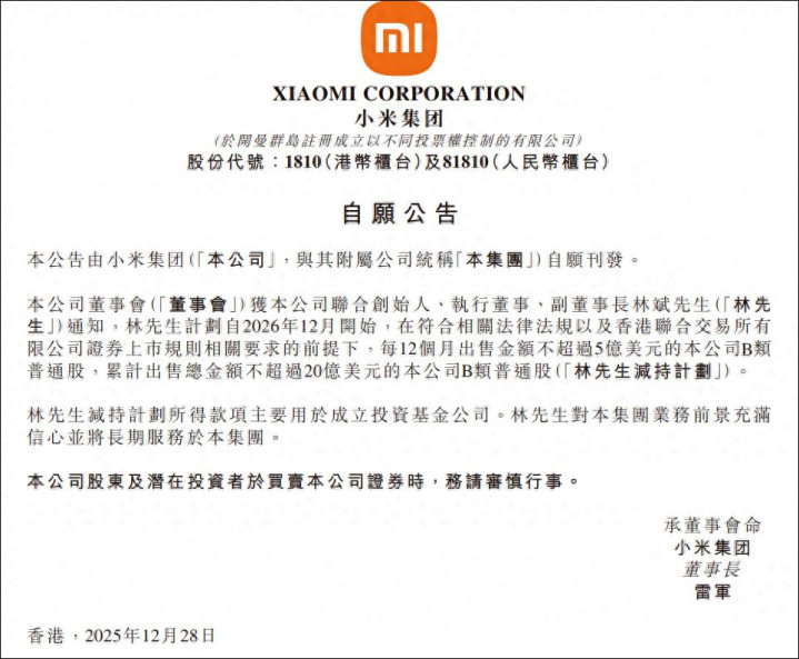 12月28日,小米(1810.HK)公告称,获公司联合创始人、执行董事、副董事长林斌通知,林斌计划自2026年12月开始,在符合相关法律法规以及香港联合交易所有限公司证券上市规则相关要求的前提下,每12个月出售金额不超过5亿美元的本公司B类普通股,累计出售总金额不超过20亿美元的本公司B类普通股。