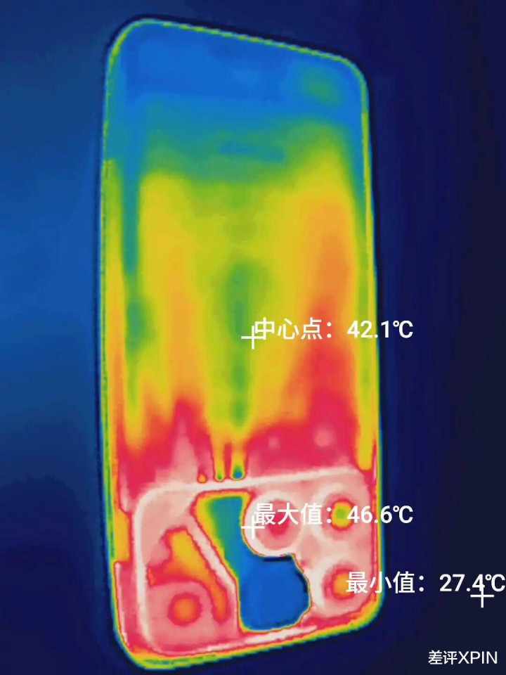 而机身背面最高温度连 40 度都不到,从测温图也能看出来风扇和风道是一大片蓝色,跟机身其他区域形成鲜明对比,这风扇有事儿是真上啊。。。